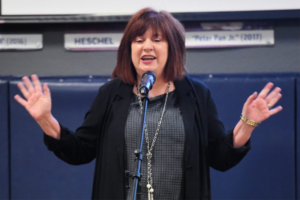 Abraham Joshua Heschel Day School | Northridge, California Paula Riley, Heschel’s assistant head of school and elementary director, opens the assembly.