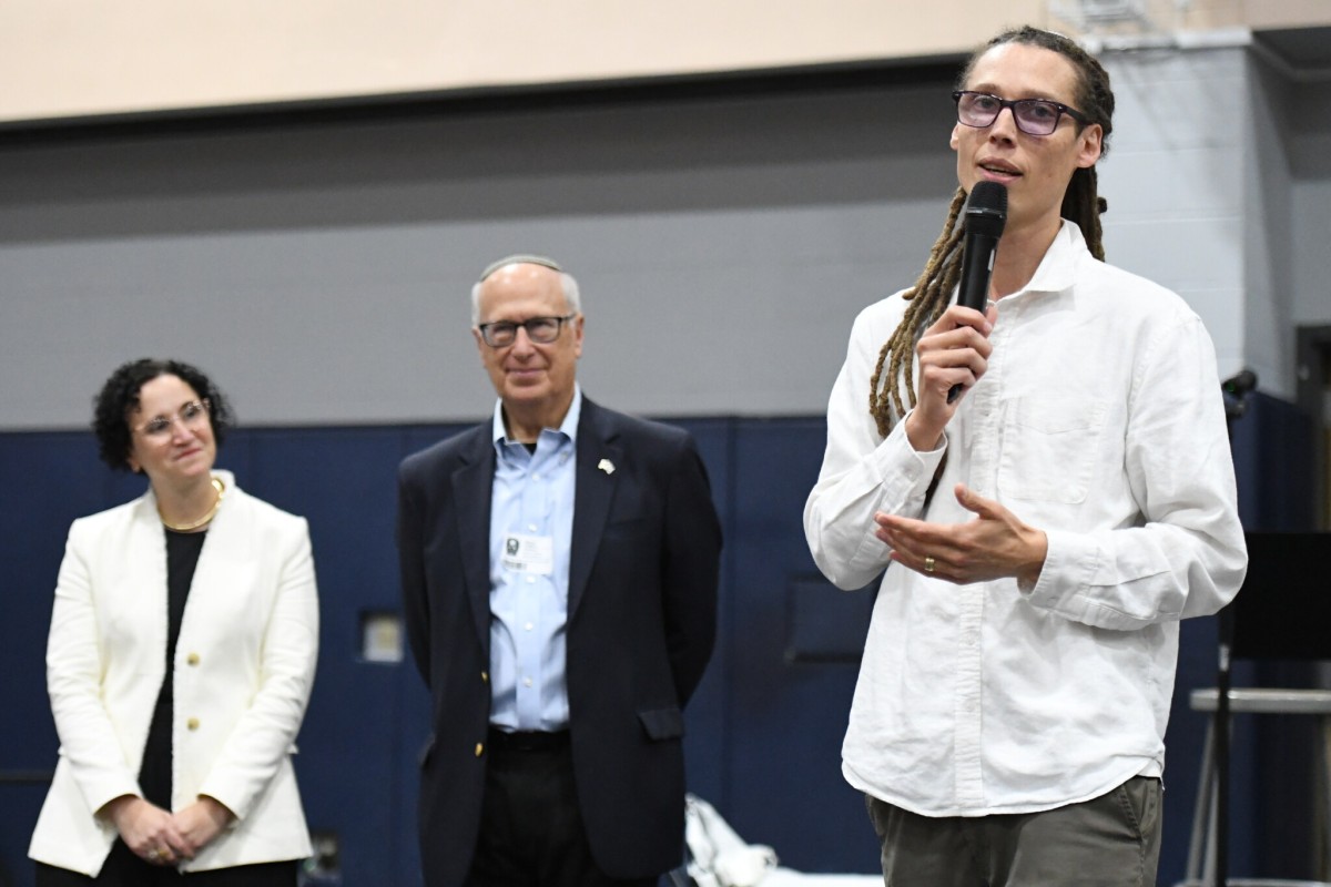 Jared Stein thanks his colleagues and students, with BJE CEO Dr. Miriam Heller Stern and former Jewish Educator Award recipient Dr. Bruce Powell, who offered him the job at de Toledo, looking on. "Every day has been a renewal of my choice to teach, and I don't regret a single minute of it," he says. "I know the work we do here isn't always for right now, it's for when the light reaches us at a later time."