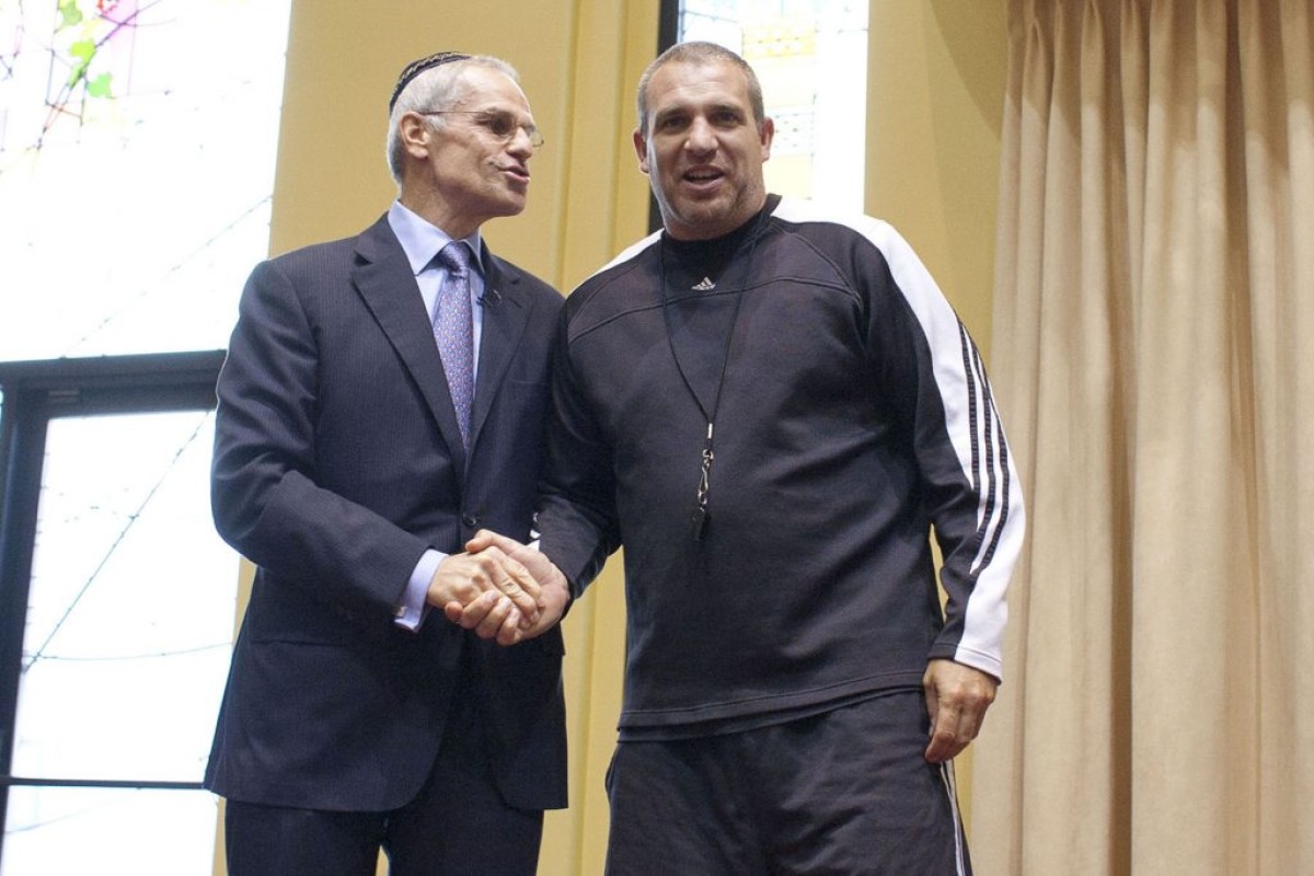 Milken Family Foundation Executive Vice President Richard Sandler congratulates Coach Sam on his 2010 Jewish Educator Award.