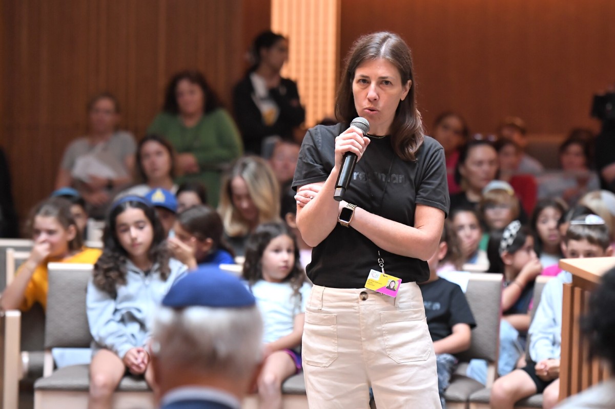 Pressman Academy Head of School Dr. Erica Rothblum reveals a secret: today's assembly is actually about celebrating the importance of Jewish education. Then, Dr. Rothblum introduces special guests who can explain more.