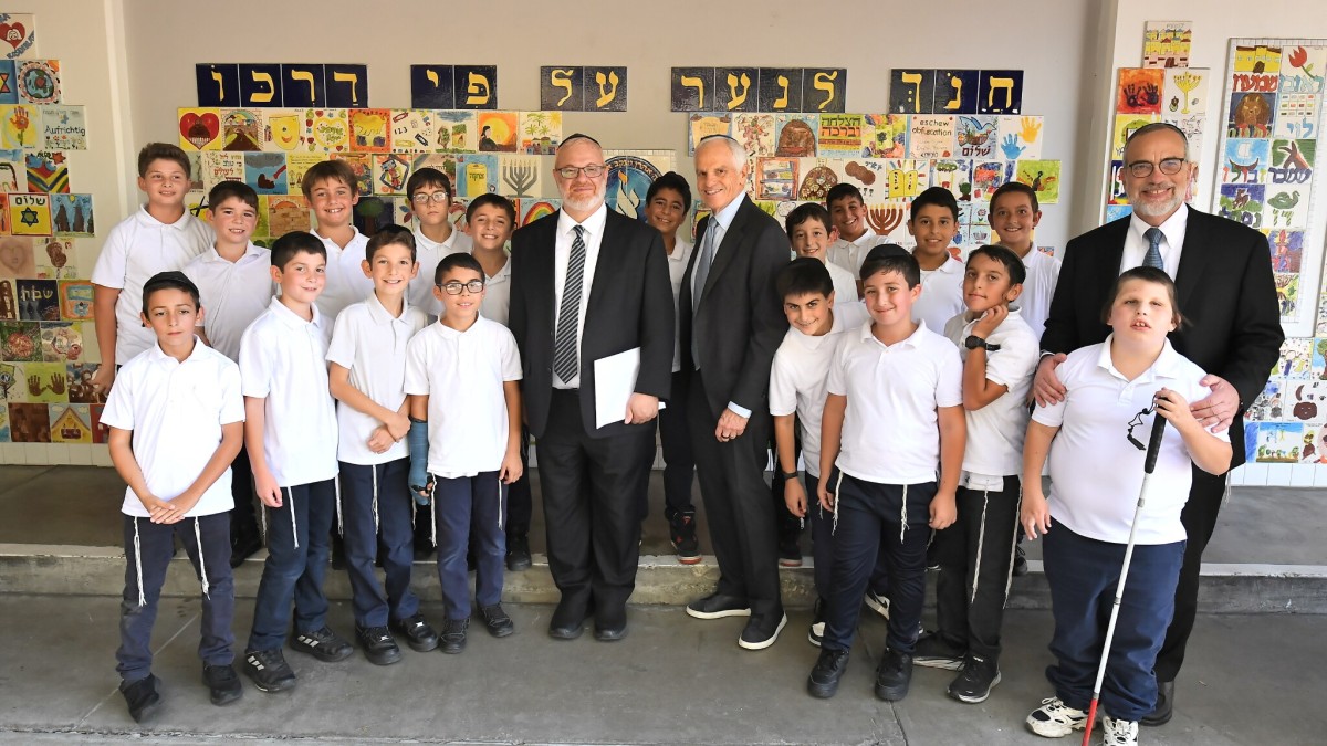 Rabbi Reuven Youkhehpaz, Milken Family Foundation Executive Vice President Richard Sandler, and Yeshiva Aharon Yaakov/Ohr Eliyahu Head of School Rabbi Shlomo Goldberg celebrate with Rabbi Youkhehpaz's fifth grade class.